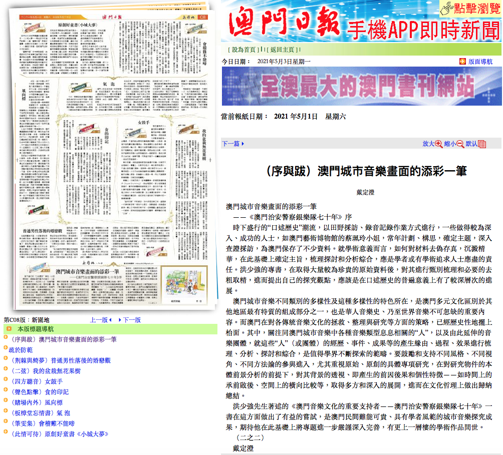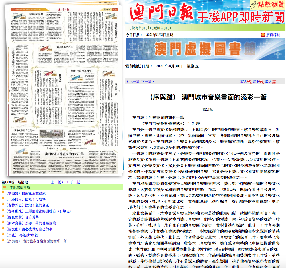 ![]() (序與跋)澳門城市音樂畫面的添彩一筆戴定澄澳門城市音樂畫面的添彩一筆——《澳門治安警察銀樂隊七十年》序澳門是一個中西文化交融的城市,有四百多年的中西交往歷史。就音樂領域而言,無論中樂、西樂,無論宗教、世俗,無論民間、官方,各個範疇的音樂都有自己的發展線索和當代成果。澳門的城市音樂具有品種類別多元、歷史線索清晰、風格特徵鮮明、數據傳承豐富、現實表現多彩的地區獨特性。 一個城市的經濟發達程度,是需要一種相應發達的文化予以平衡及支持的,而即使是經濟及文化在同一個城市有着共同發達的狀況,也並不一定等於城市現代文明的發達。文明程度是需要文化、尤其是具有歷史和民間傳統特色的文化的長期潛移默化之薰陶和催化的。作為文明重要演化手段和途徑的音樂,尤其是帶有城市文化和文明傳統徵象的本土意識的城市音樂,是城市現代文明化過程中最重要的通道之一。 澳門地區開埠時間雖短卻得天獨厚的音樂歷史傳承,城市雖小卻獨樹一幟的音樂文化體驗,人數雖少卻多元和諧的音樂文明傳統,在二十世紀以來,既保存着各自發展軌跡,又互尊包容,不同而和,並以更為豐富的新時空特徵向前發展。而對相應音樂文化傳統的發掘、梳理、分析或比較,並在此基礎上進行綜合,提出獨特的學術觀點,則是現代都市音樂學界的重要責任之一。 就此意義而言,本澳資深音樂人洪少強先生著述的此書出版,就顯得難能可貴:在一定的歷史時間範疇內探討澳門城市音樂中一個特定的領域,由不少珍貴資料的採訪、收集、分析,梳理出一段有血有肉的音樂斷代專史,並對其進行探討,此其一;作者長期在警察樂隊工作並擔任樂隊的指揮之一,對樂隊運作的親身經歷體驗和對之深厚的情感寄託,外人難以替代,此其二;作者曾參與大量本土音樂文化的保育工作,如主持《集樂澳門》協會及相關學術網站,收集本土音樂資料;擔任筆者主持的《中國民間歌曲集成 · 澳門卷》和《中國民間器樂曲集成 · 澳門卷》項目副主編,親力親為參與項目的採訪、攝錄、製譜等具體事務;也應邀擔任本土作品唱碟的錄音和後期製作工作等,這些經歷,使得他對田野採錄工作有着深入的體會。毫無疑問,這是他在資料取得方面的優勢,而一手資料的取得,則是學術工作中重要的基礎工作,此其三;作者編輯文化局項目《澳門音樂年鑑(二○一三 )》和近期主編《澳門城市音樂與西歐早期音樂研究》一書成功出版發行的經驗,則使他同時具備了較強的音樂學術探討能力,此其四。 綜上所述,作為一位土生土長的澳門音樂人,洪少強在親身採訪攝錄、親手分析梳理,親手動筆寫作各方面,都累積了較為豐富的學術經驗,本書的出版,是水到渠成之例。(二之一) |