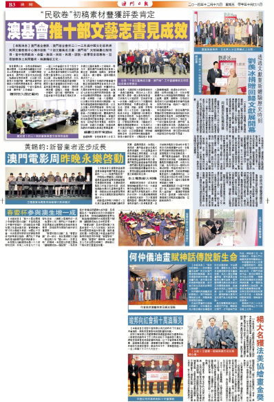 澳門基金會訊:澳門基金會於二○一二年與中國文化部民族民間文藝發展中心攜手啟動“十部文藝集成志書 · 澳門卷”大型編纂出版項目,當中包括戲曲、曲藝、舞蹈、民歌、民謠、諺語、故事等多部專卷,旨在搶救本土民間藝術、保護傳統文化。