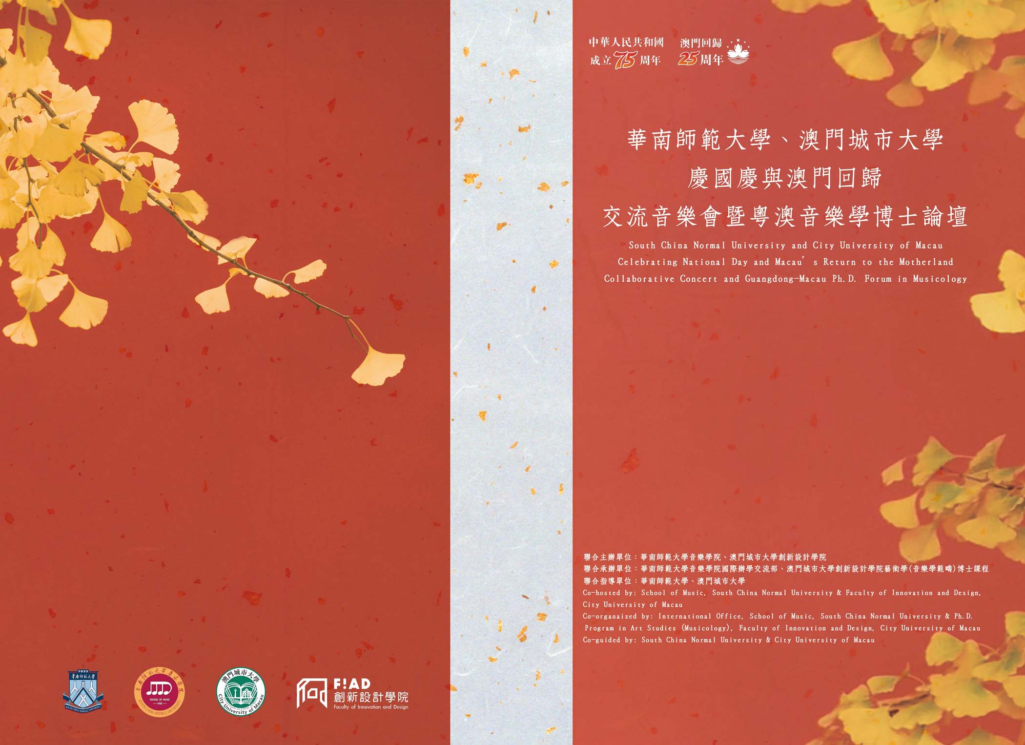 由澳門城市大學創新設計學院與華南師範大學音樂學院共同舉辦的“慶國慶與澳門回歸”交流音樂會11月20日在城大凼仔校區文化中心上演。本次活動由城大教授、著名音樂學家及作曲理論家戴定澄,與華南師大音樂學院院長孔義龍擔任學術指導與藝術總監,旨在慶祝中華人民共和國成立75週年及澳門回歸祖國25週年,為觀眾帶來了一場粵澳兩地高等音樂院校文化交融與情感共鳴的文化盛會。