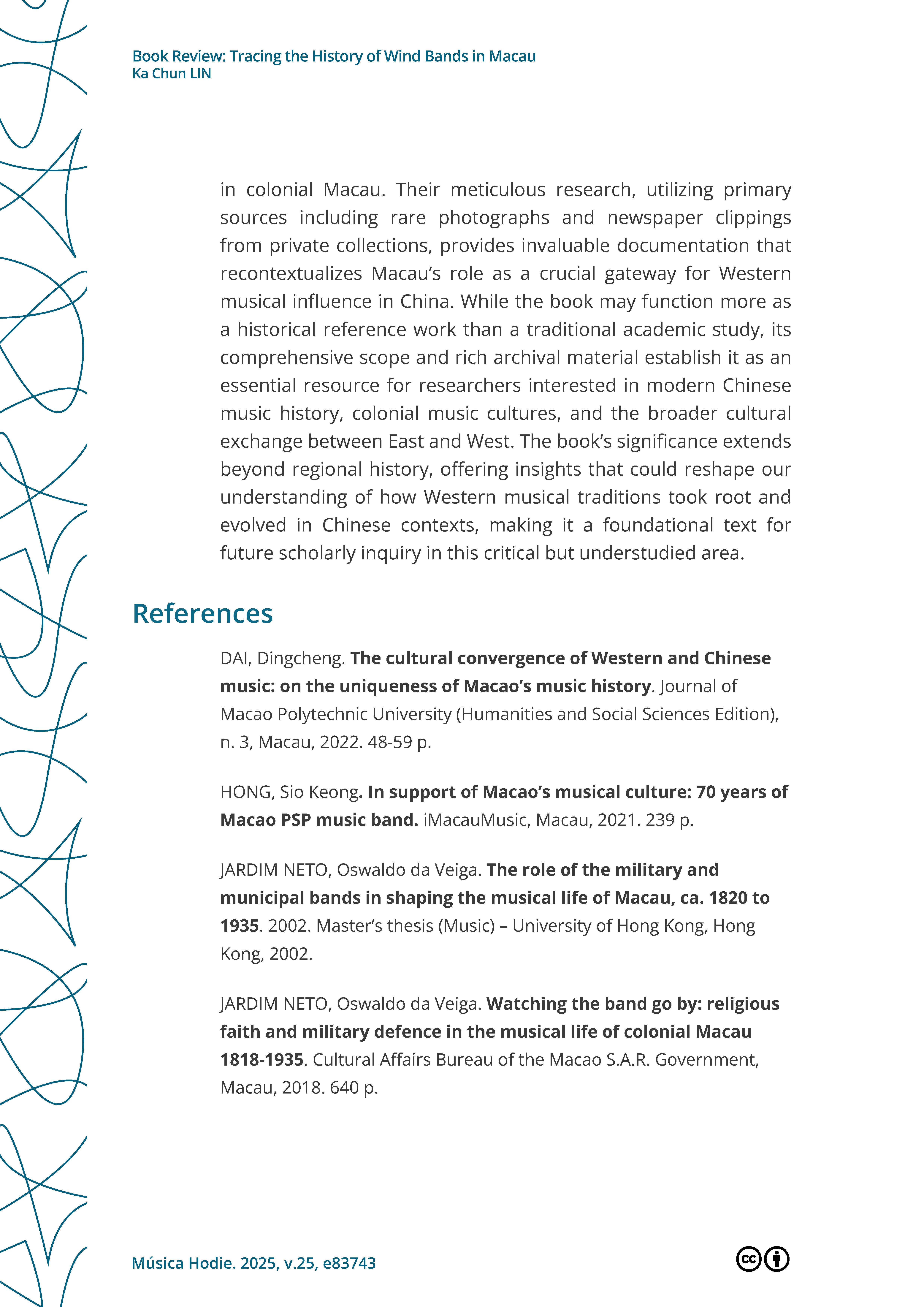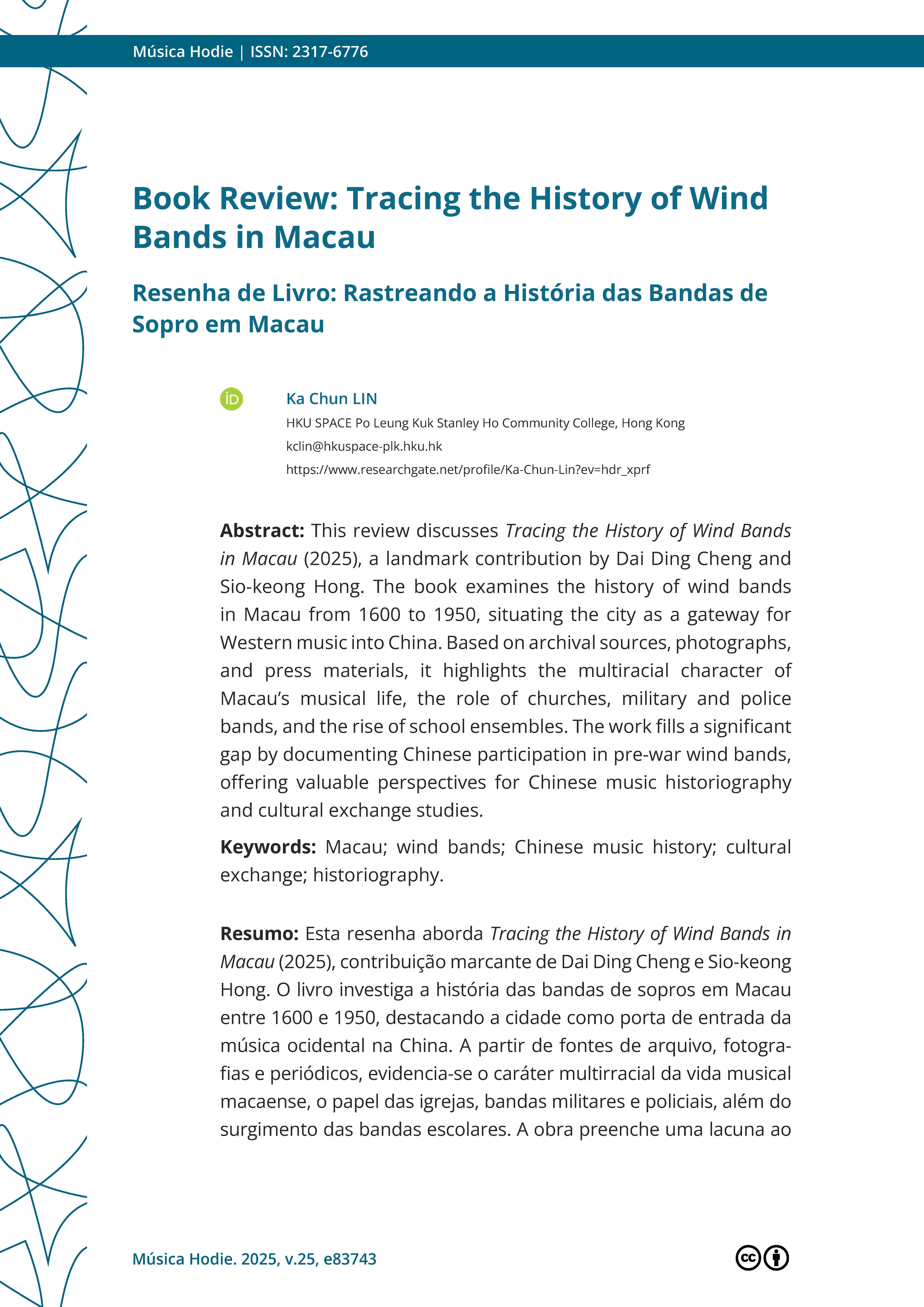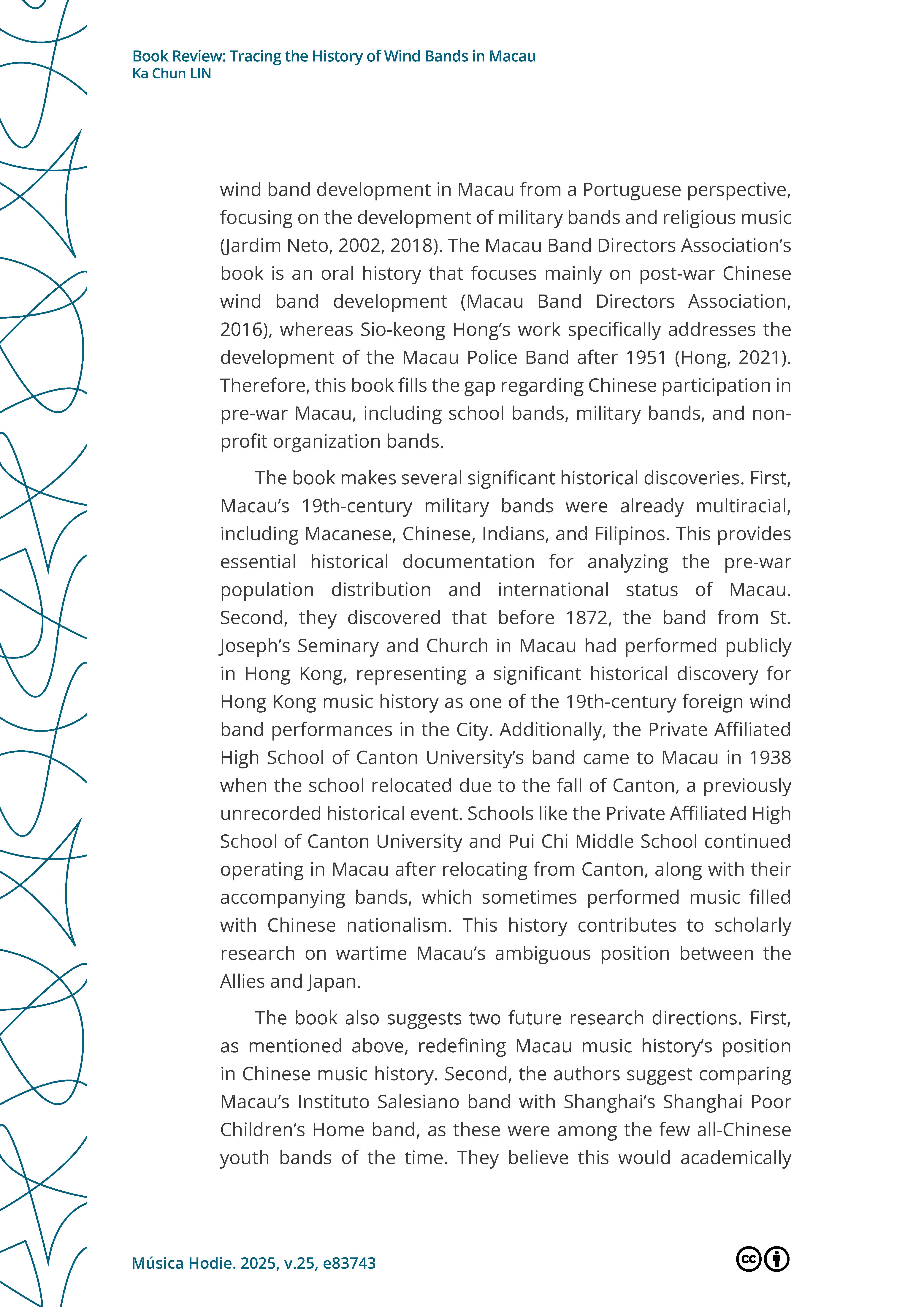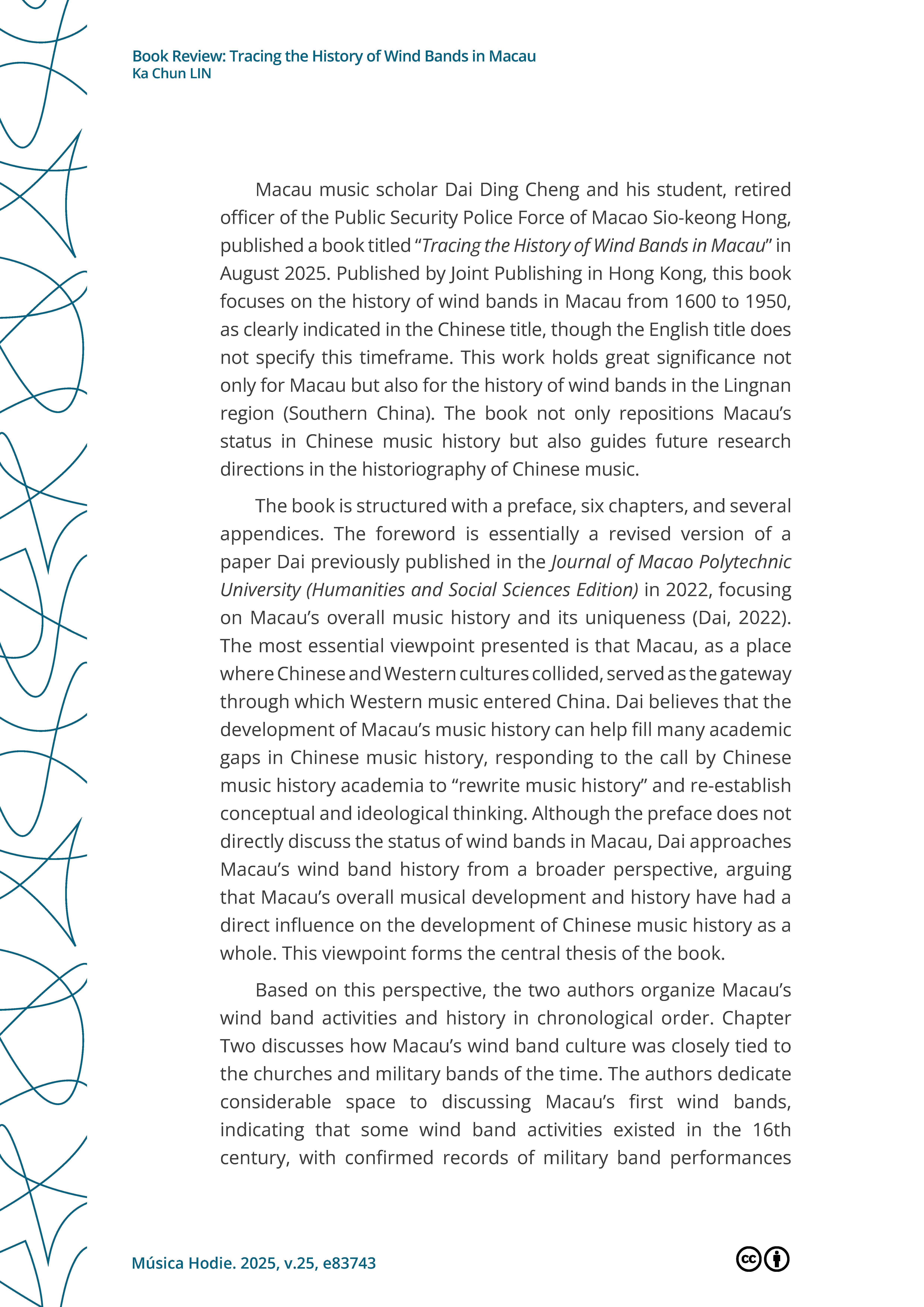>>外界評價 學術界對戴定澄研究成果的評論Lin, K.Chun. (2025, October 23). Book Review: Tracing the History of Wind Bands in Macau.Música Hodie. https://revistas.ufg.br/musica/article/view/83743 |