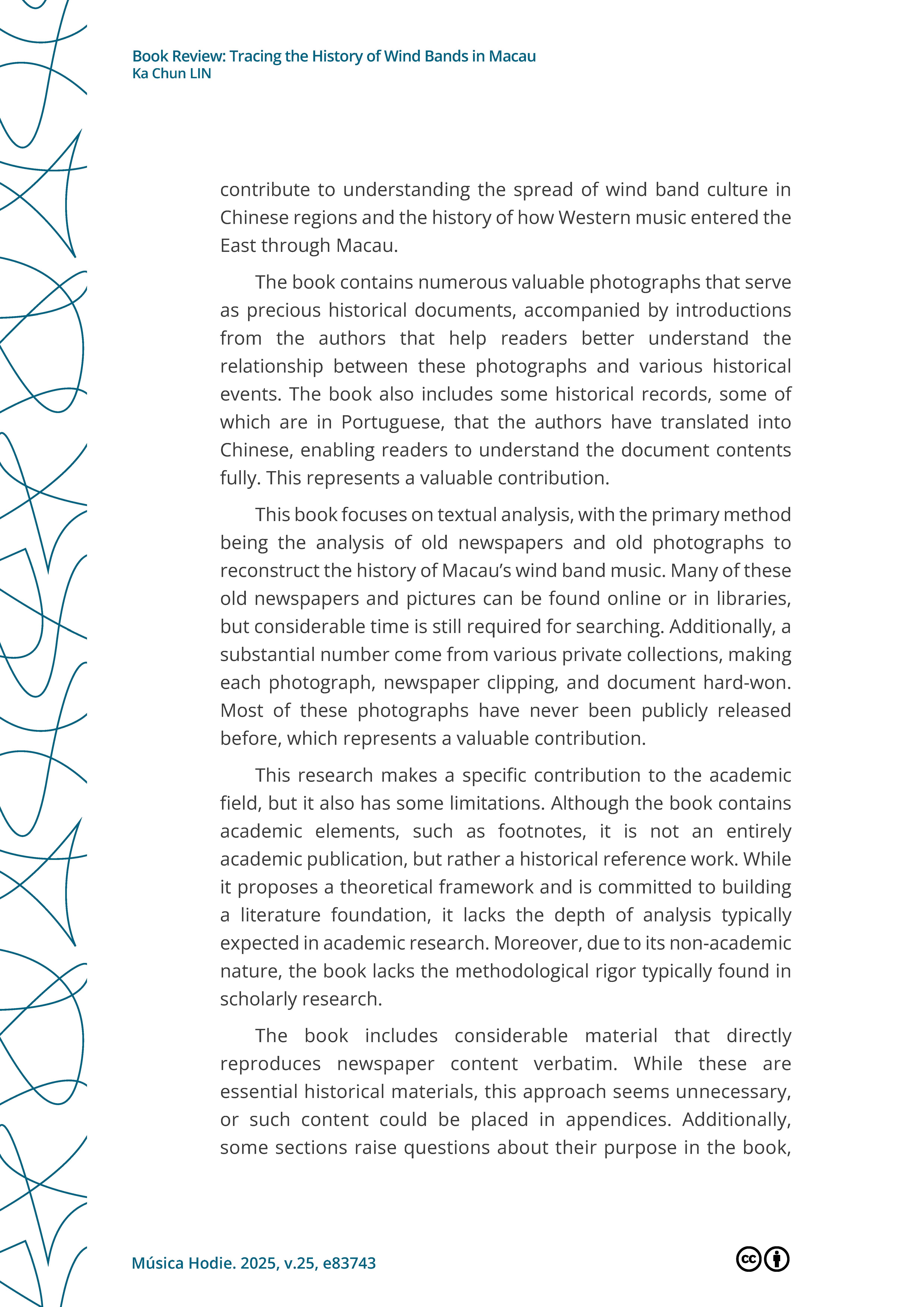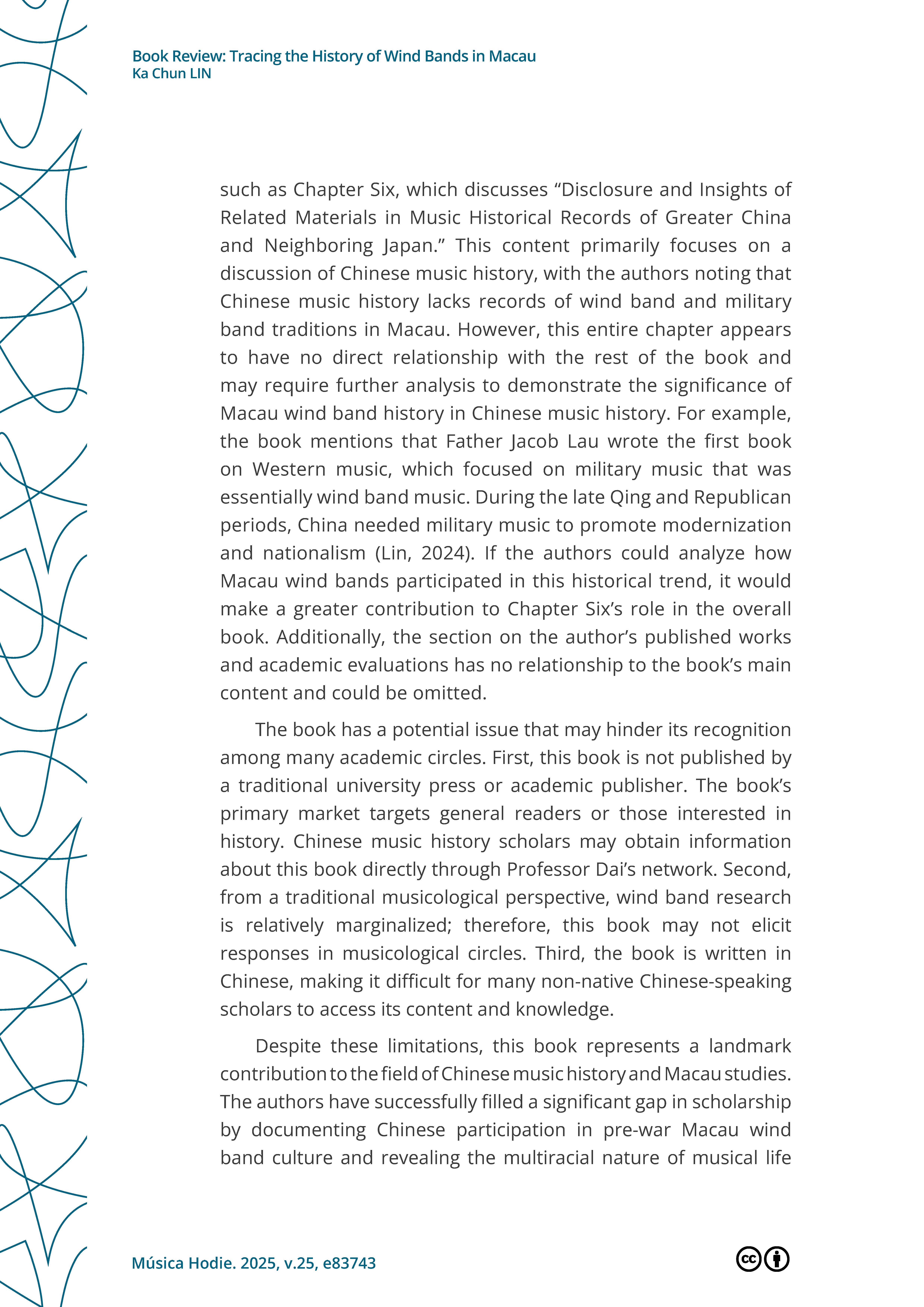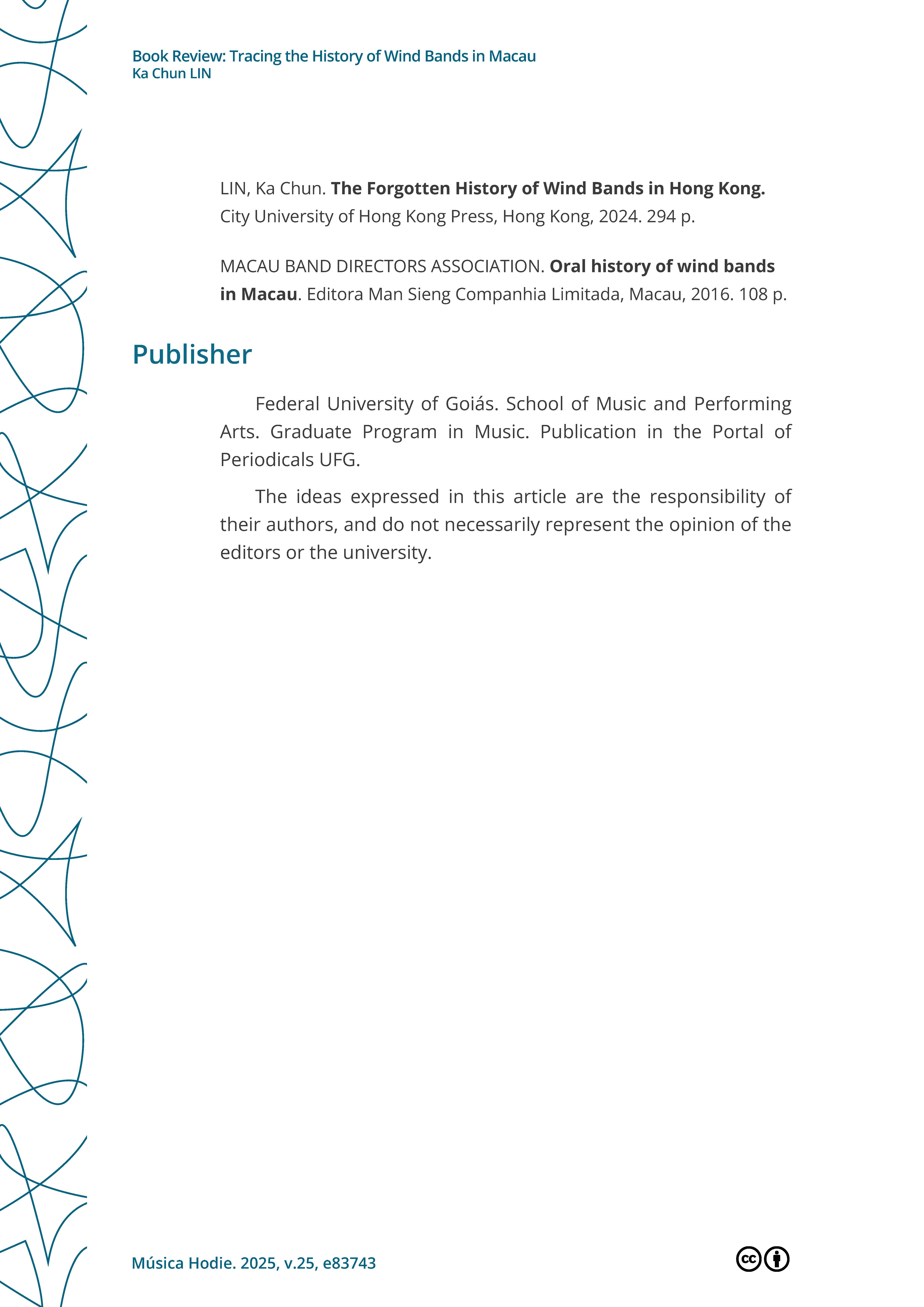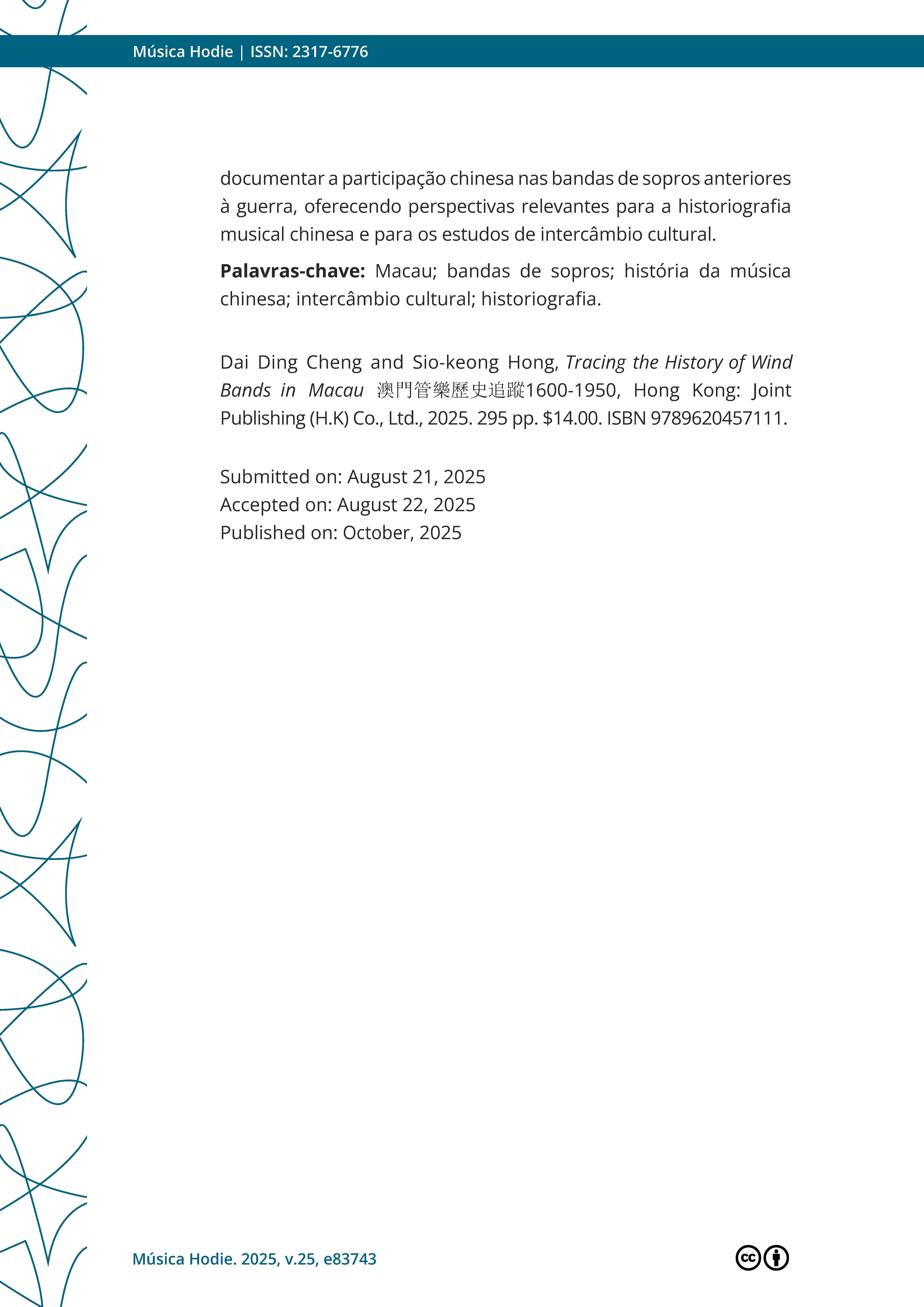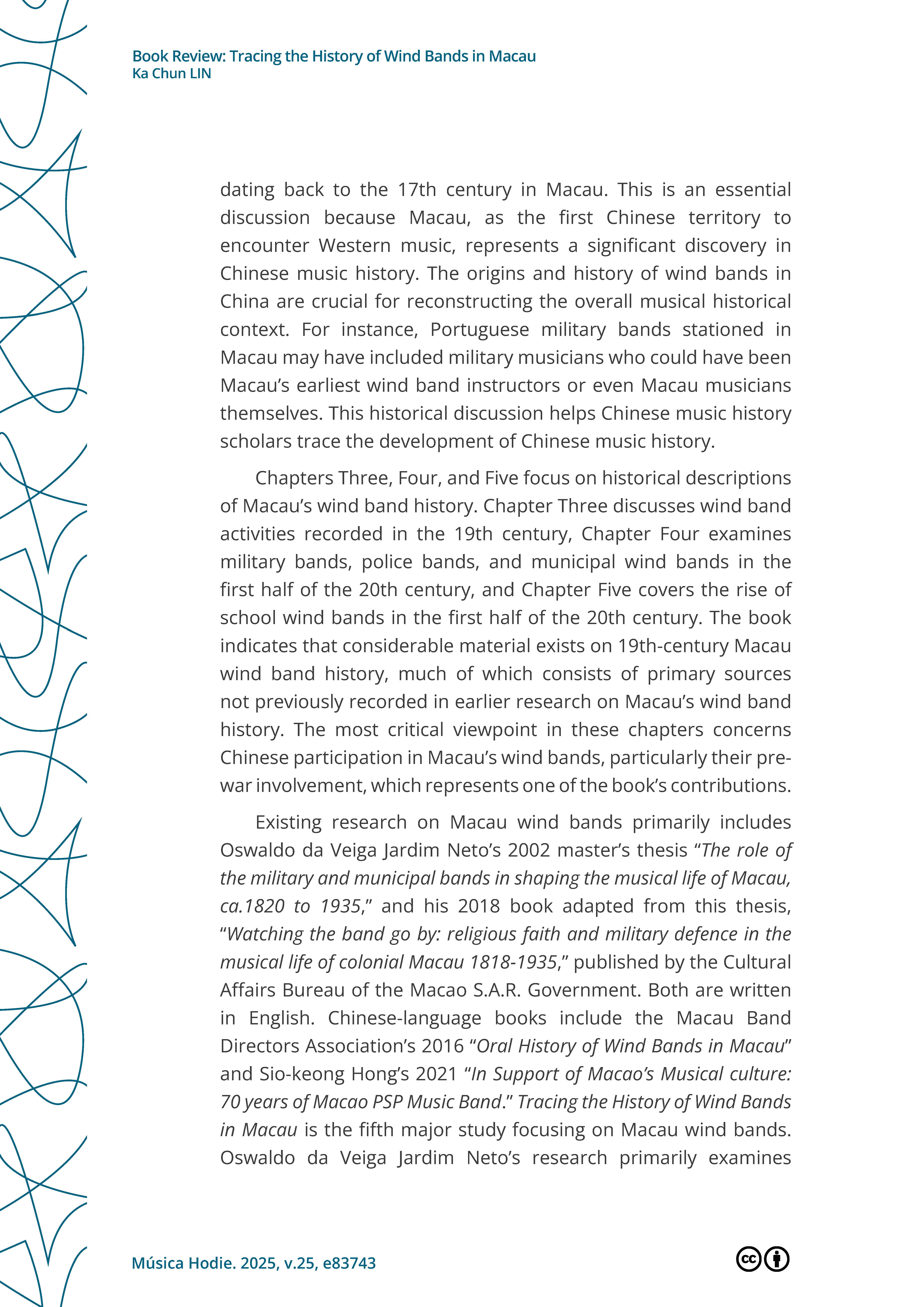 >>外界評價 學術界對戴定澄研究成果的評論Lin, K.Chun. (2025, October 23). Book Review: Tracing the History of Wind Bands in Macau.Música Hodie. https://revistas.ufg.br/musica/article/view/83743 |